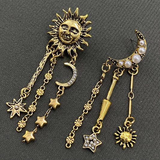 Star Fringe Asymmetric Sun Moon Post Earrings - MS