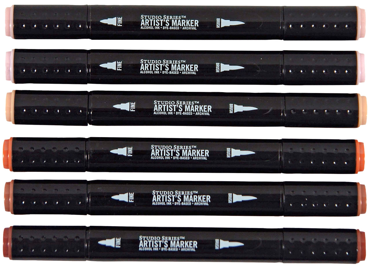 Achieve both subtle skin-tone shading and dramatic effects with this wide-ranging dual-tip alcohol marker set. Great for portraits, figure drawing, comics, and all illustrations of people. Set includes 6 alcohol ink markers. 2 tips: fine for detail work, brush for broad-area coverage. Archival quality. Dye-based. Super blendable, both before and after ink dries. Optimal ink flow for even saturation. Great for illustration, design, sketching, crafting, coloring, cartooning, and more! Works on paper, fabric, glass, wood, metal, and ceramic. Perfect for Peter Pauper Press Coloring Books. An excellent supplement to Peter Pauper Press's full-spectrum marker set. Use with quality heavyweight paper. Marker set comes in a sturdy, reusable organizer case.