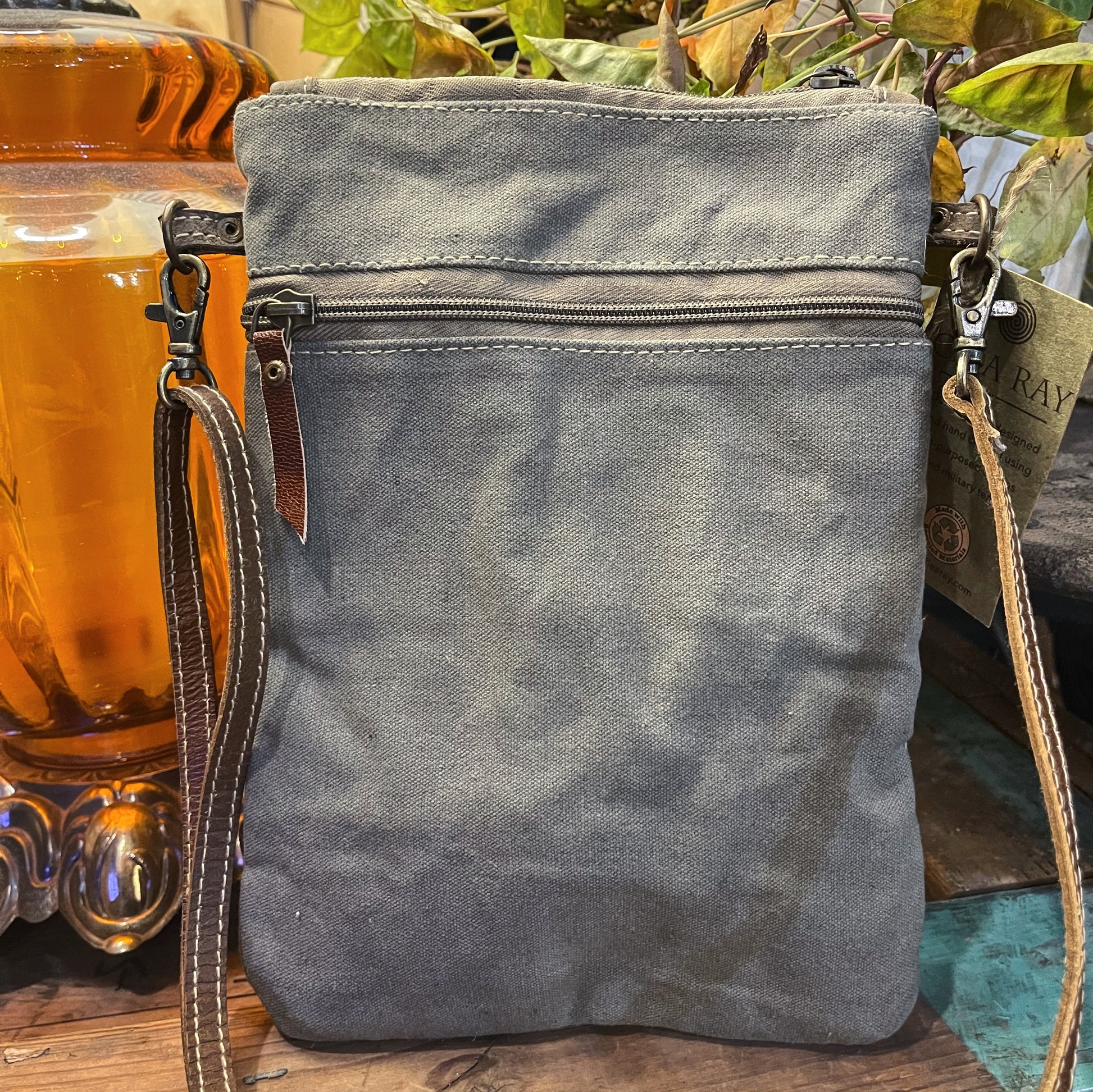 re-purposed canvas and leather straps. 8x10.5"