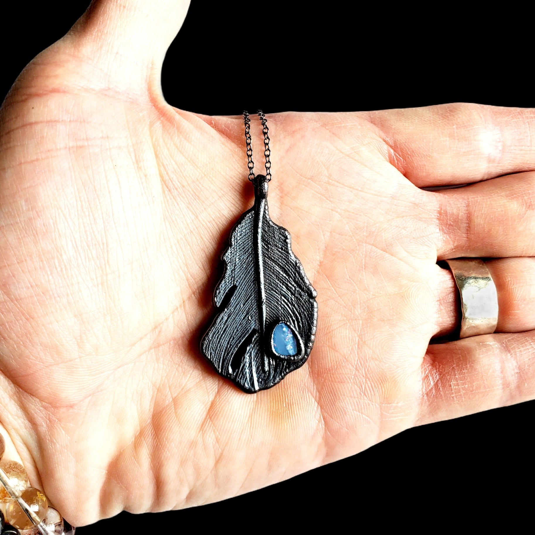 One electroformed copper Blackened Crow Feather with Australian Opal complete on a 20" soldered gunmetal chain. Gunmetal patina feather. Crows are said to symbolize transformation and change. Have you ever met a crow who insists on getting your attention? Large, black, and with a unique gift for communication, these birds don’t attempt to interact with just anyone. Crow symbolism across cultural myths, as well as what we know from modern studies, shows that crows are intelligent, insightful creatures that have much to teach us.