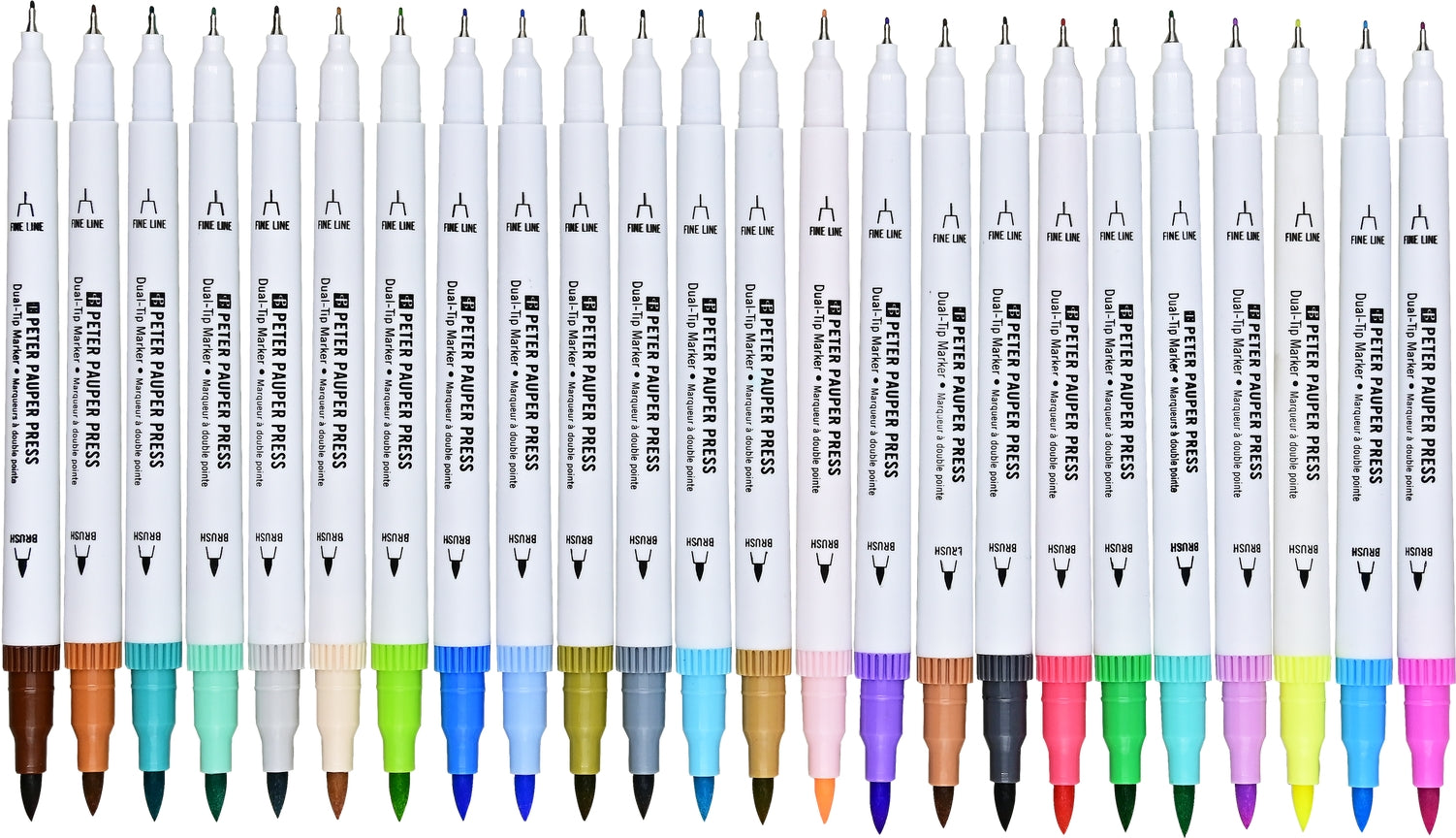 24 beautiful pastel hues! A versatile range for a variety of art projects! Each marker has 2 tips: Fine (0.4 mm), for intricate detail work and underlining; and Brush, for broad area coverage and highlighting. Acid-free, water-based ink is fast drying and fade-resistant. Perfect pastel color selection! Soft pinks, blues, greens, yellows, and more.