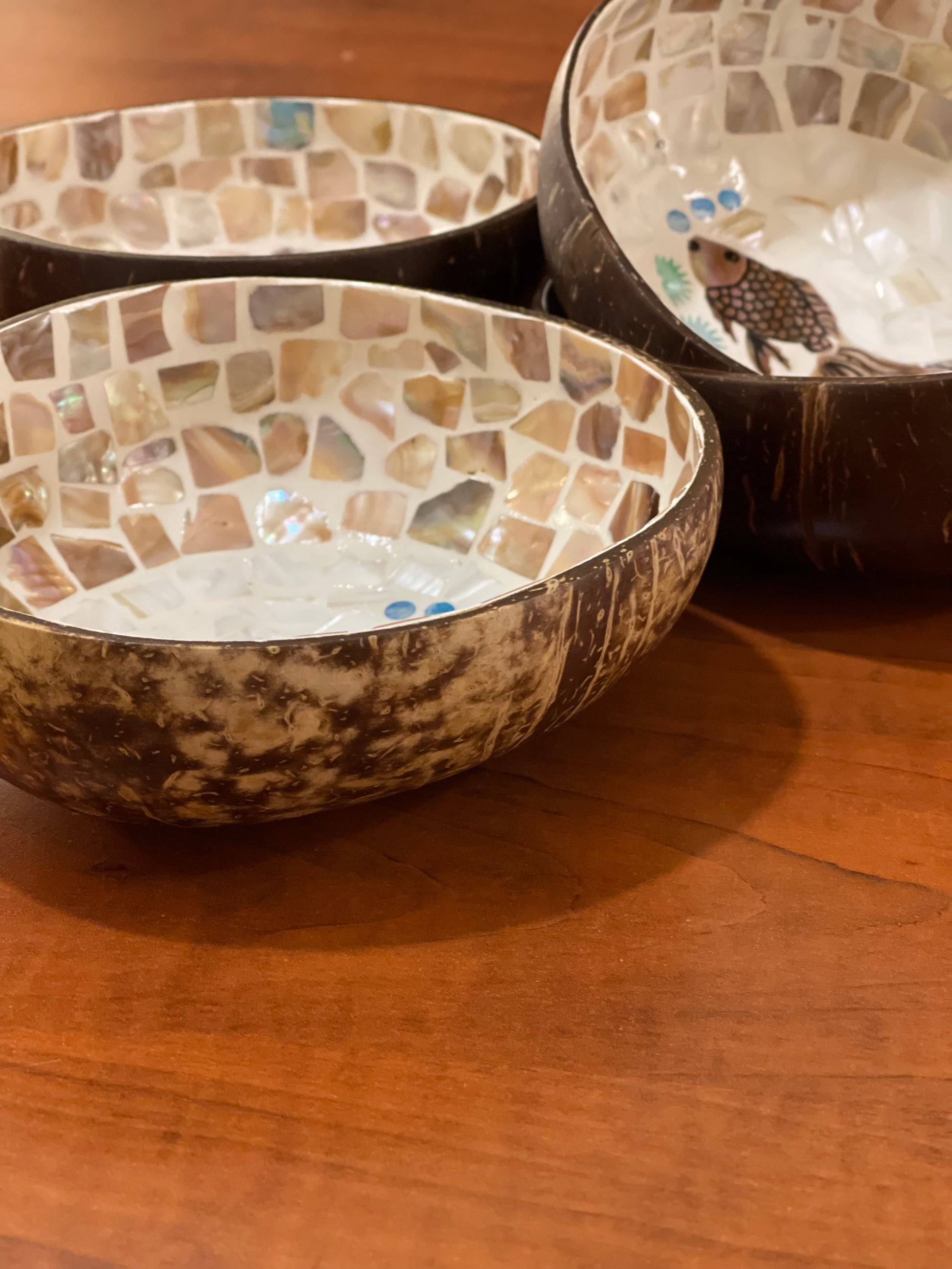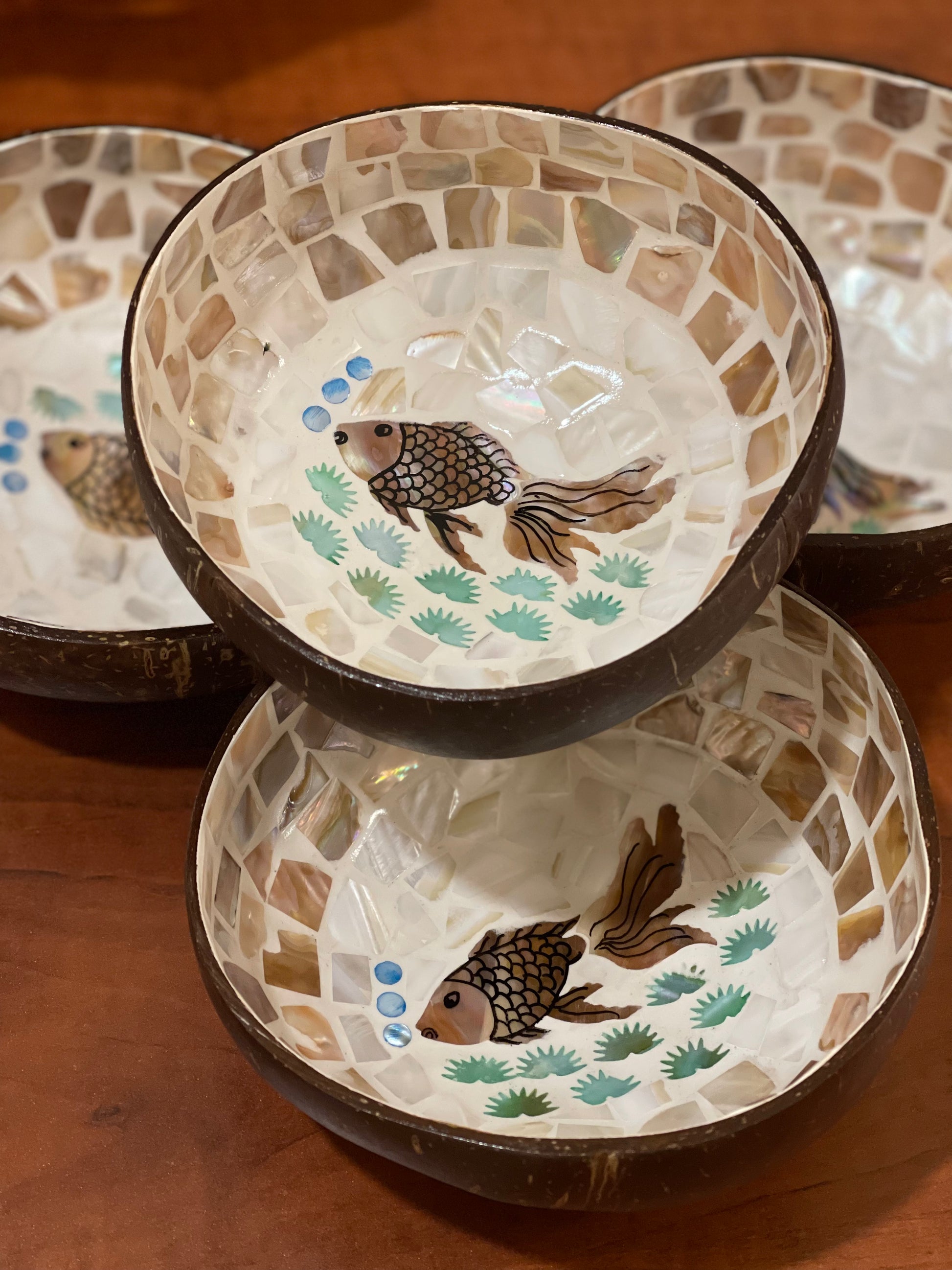 Fish design mosaic inlay coconut shell bowl