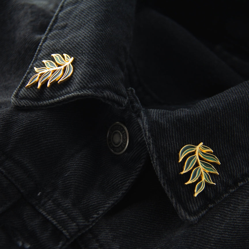 This elegant pin set features two brooches shaped like sprigs of leaves. They are the perfect size and shape to decorate the lapels of a denim jacket or shirt. Wear for an instant hint of botanical style.