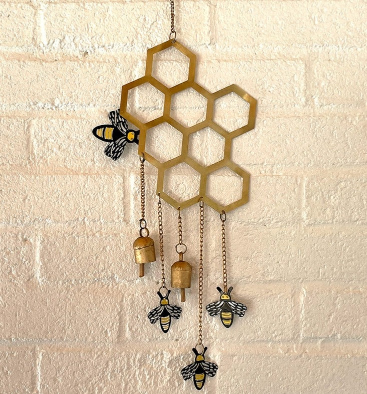 Buzz buzz! Celebrate Spring with this hand-painted chime that will delight all. Perfect for hanging in your garden or porch - it features two gold-painted bells and four cut-out bees in bright, cheerful colors. If hanging outside we recommend spraying with a clear coat to preserve longevity and color.