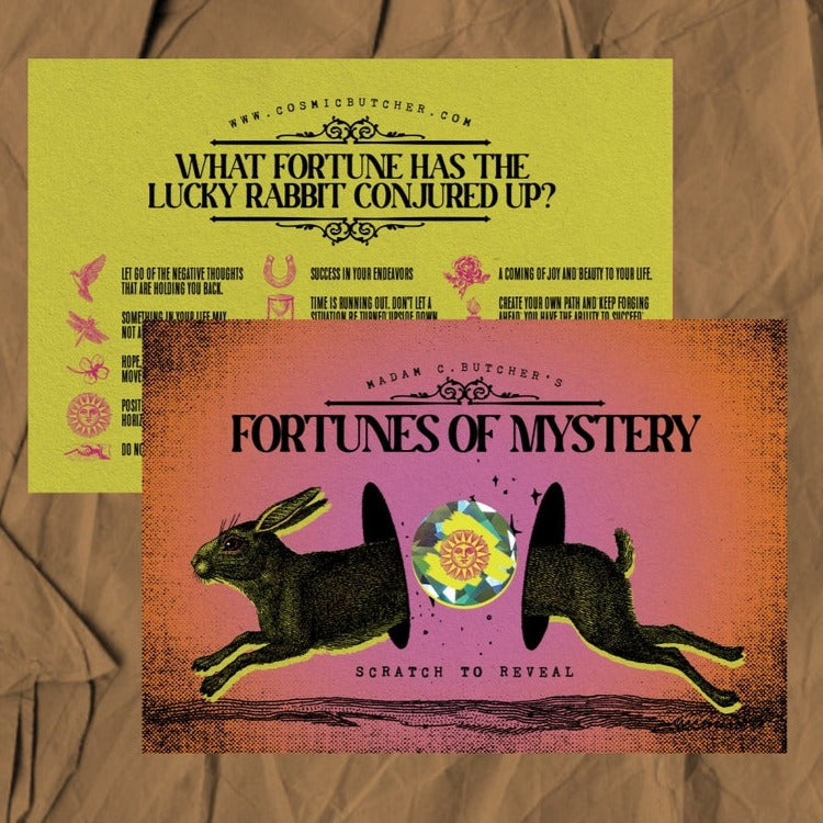✶ A 4”x6”, scratch-off card and mini art print that features the fifteen (15) different mystery charms and coinciding fortunes as possible outcomes. The front features original artwork with a scratch-off sticker that will reveal your mystery charm. On the reverse side, a guide featuring the mystery charms and meanings.