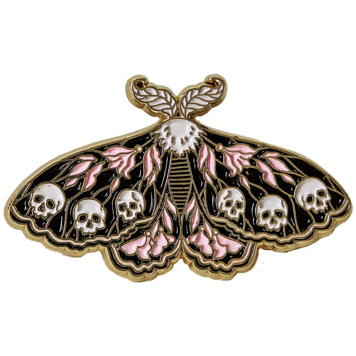 An elegant enamel pin, inspired by nature's darkly beautiful circle of life. Features a moth with wings adorned by pale pink flowers and human skulls.