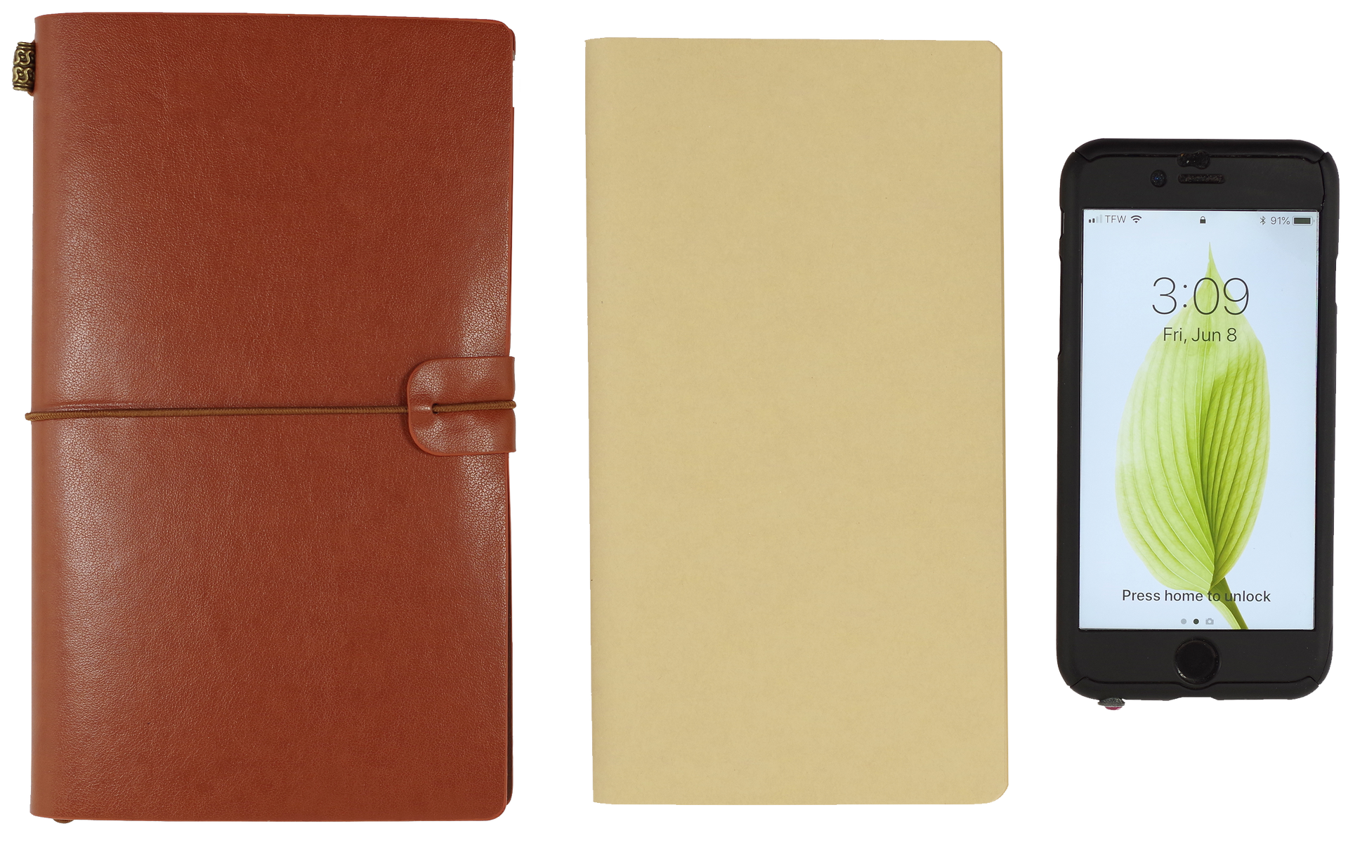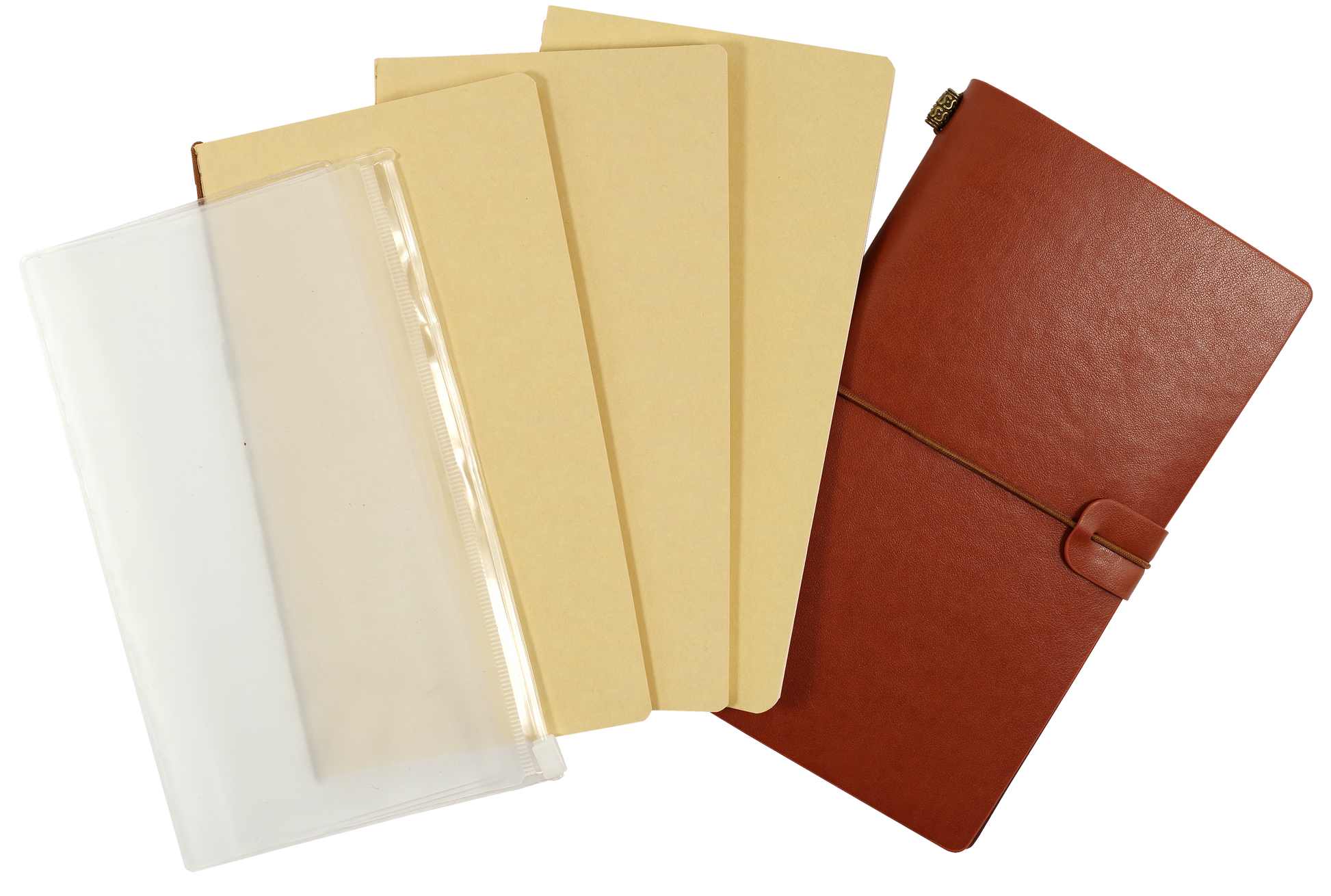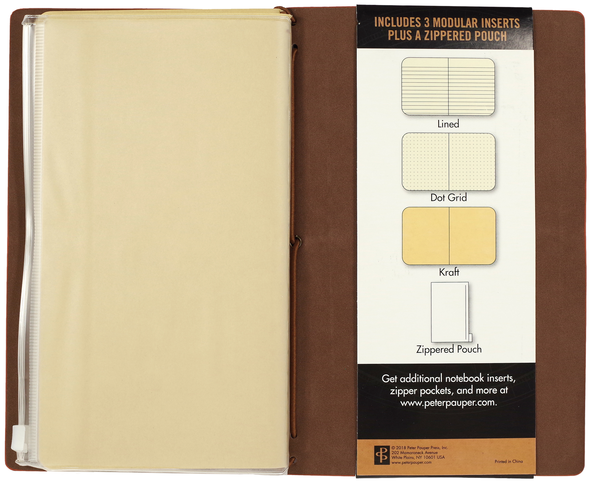 Versatile Voyager Notebook is perfect for journaling, sketching, note-taking, and creative planning on the go! On the outside: A durable, flexible faux leather cover. On the inside: 3 separate 60-page notebook inserts: A Lined Pages insert A Dot-Grid/Dot Journal Pages insert A blank Kraft Paper Pages insert Plus: A clear storage pocket inside the front cover. A clear zippered storage pouch inside the back cover. Interior stretchbands, elastic closure, and protective front-edge flexi-tab to keep it all together. Premium 80 gsm paper supports pen or pencil. Paper is acid-free and of archival quality. Notebook is accented with a bronze barrel bead with incised ''s'' pattern Voyager is compatible with most modular notebook refills. <