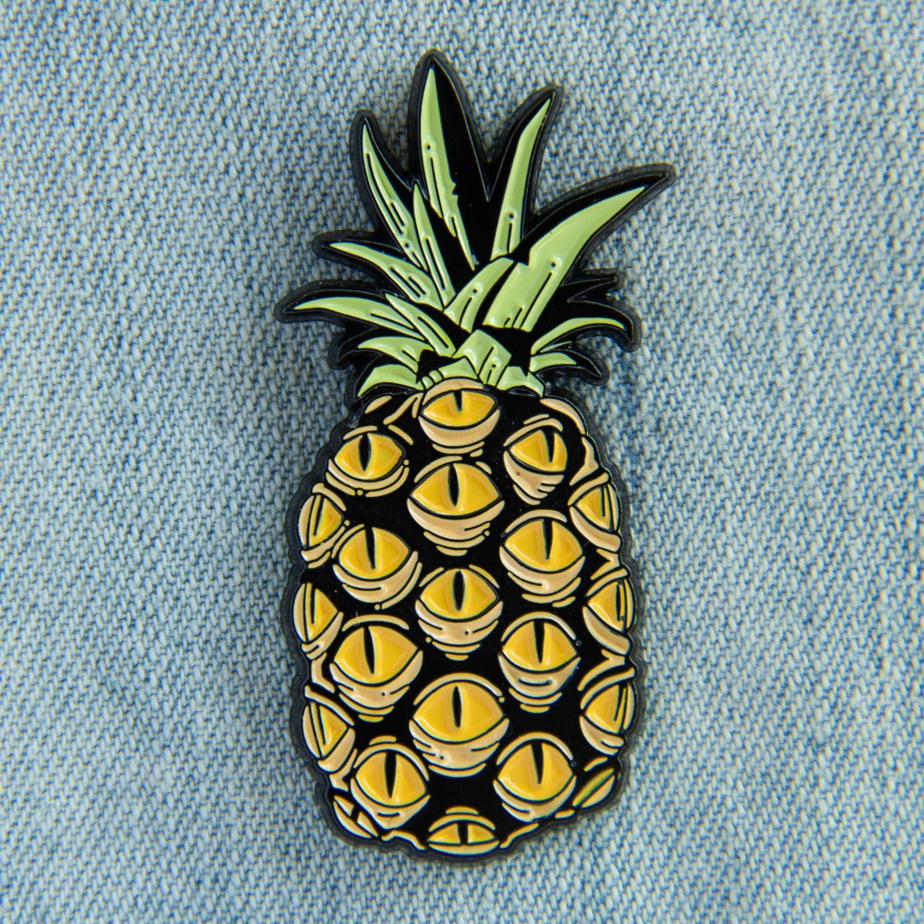 An oddity of the tropics - this pineapple is covered in eyes! It's a pEYEnapple! Would you eat it? Looks cool on the lapel of a denim jacket, a baseball cap, lanyard, and more. Great for beachy punk style.