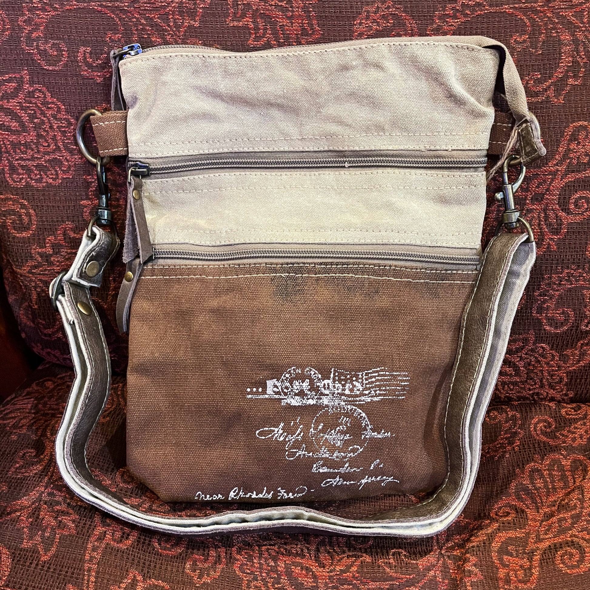 re-purposed canvas and leather straps. Double zipper front. 9.5x12"