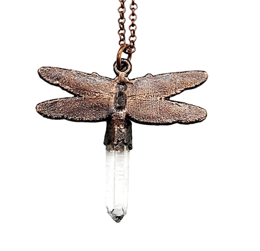 One copper electroformed quartz crystal dragonfly complete on a soldered 24" copper chain.