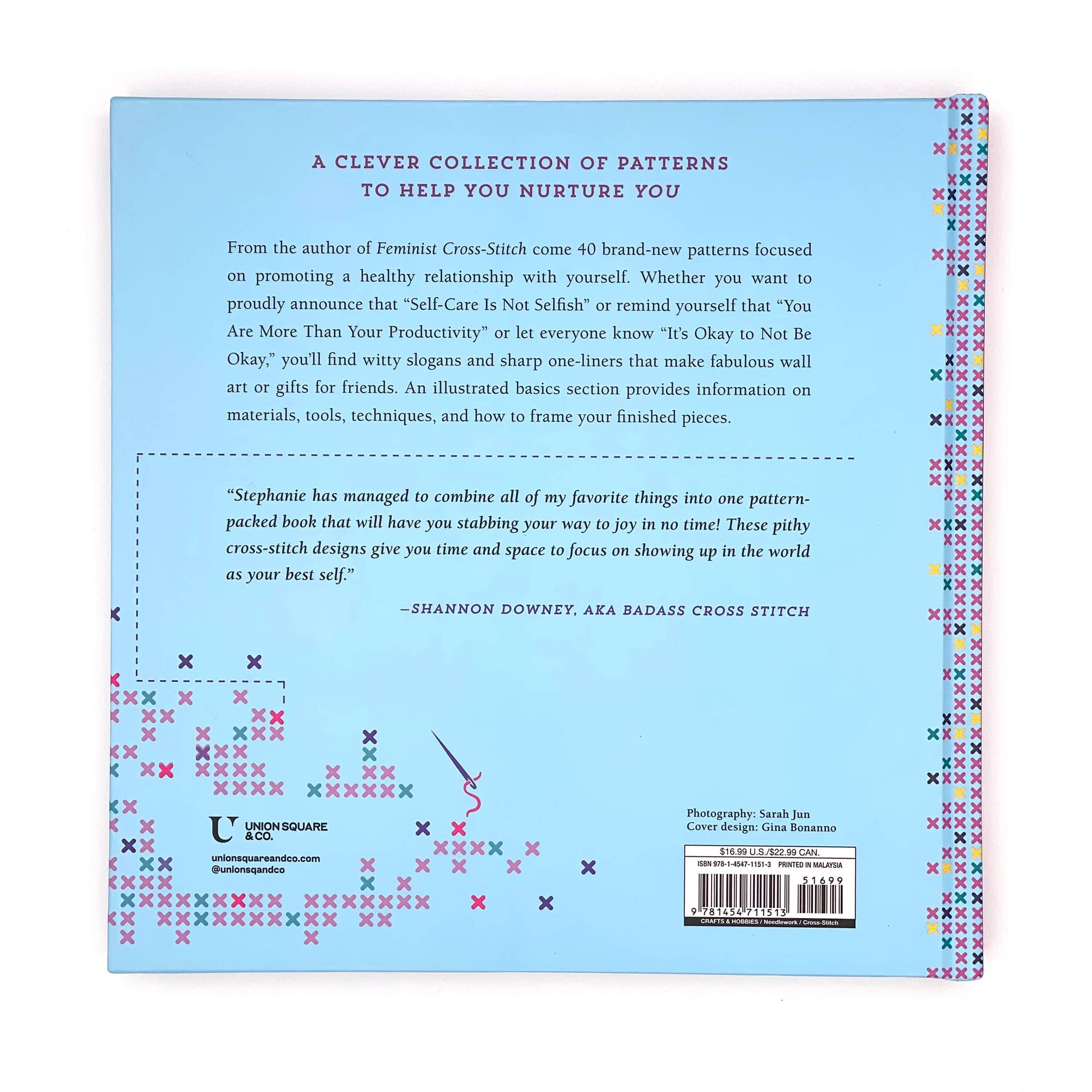 From the author of the successful and provocative Feminist Cross-Stitch comes a new collection of 40 patterns to help you practice self-care. Crafters will love this snarky book with its 40 witty cross-stitch patterns that focus on promoting a healthy, self-affirming relationship with yourself. Whether you want to proudly announce that "Self-Care Is Not Selfish" or remind others that "You Are More Than Your Productivity" or "It's Okay to Not Be Okay," you'll find edgy slogans and sharp one-liners that make fabulous wall art or gifts. An illustrated basics section provides beginners with information on materials, tools, techniques, and framing finished pieces. Hardcover book with printed laminated cover; 8 x 8 inches; 136 pages.