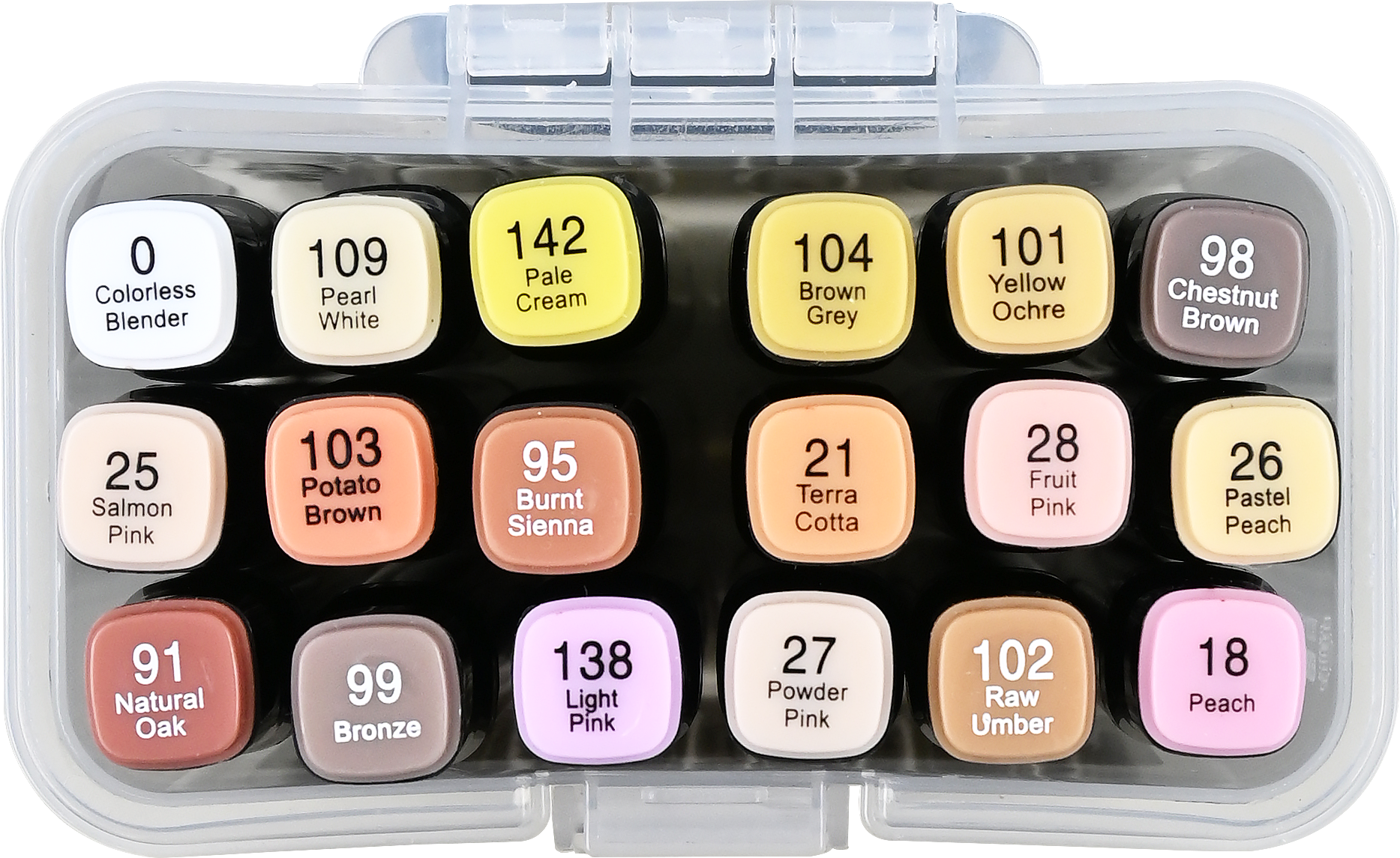 Create smooth, vivid areas of color and blend for stunning shading and delicate watercolor effects! Versatile set of skin-tone alcohol markers comes with 18 colors! Each marker contains dye-based, archival-quality alcohol ink. Dual-tip design features both a chisel tip for broader coverage and a brush tip for detail work. Enjoy optimal ink flow for even, consistent saturation and painterly effects. Perfect for illustration, sketching, portraits, comics, and more. Use on paper, fabric, glass, wood, metal, and ceramics. For creators of every skill level! Set includes a sturdy reusable case that keeps markers safe and organized when not in use. Case measures 4.4'' wide x 2.75'' deep x 6.6'' high.