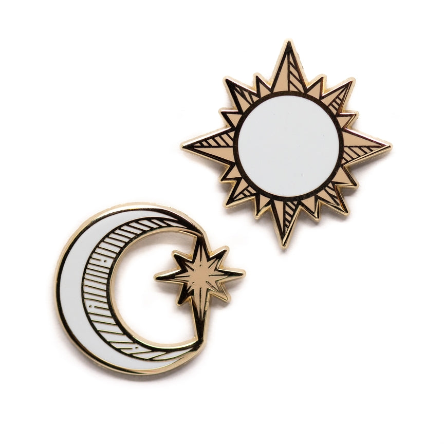 - These celestial pins make a gorgeous accessory to be worn on the lapels of your jacket or shirt. On one side wear a brilliant sun and on the other, the moon with a star. Also great for sharing with a friend!