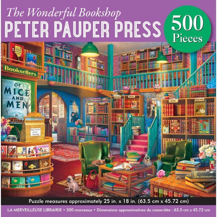 Have a seat and relax awhile in this magical bookshop! What's your pleasure? History, Mystery, Fantasy, or Poetry? Curl up with a book and a bookstore cat (or dog)! Get lost in this beautiful bookstore puzzle! Watch the vibrant scene come together, piece by piece! 500 precision-cut pieces fit snugly. Linen-textured surface reduces glare. Durable premium blue puzzle board. High-resolution puzzle image features rich, sharp, vivid color. Full-sized, full-color poster of finished puzzle included for your reference. Hours of fun! Finished puzzle measures 28'' wide x 20'' high. Sturdy, full-color puzzle box measures 9-1/4'' square x 2'' deep. Warning: Choking hazard. Small parts. Not for children under 3 years.