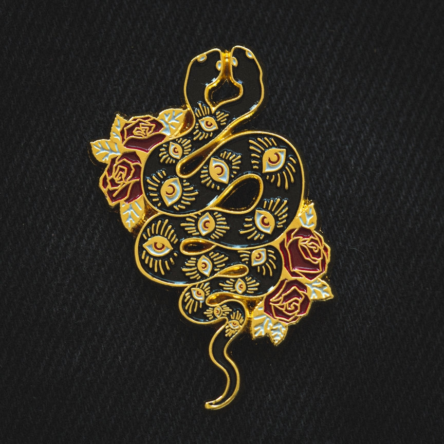 This magical enamel pin features a two headed snake with illuminated eyes adorning its coiled body. On each side of the snake are beautiful red roses. Cast in gold, this brooch stands out on a jacket, lanyard, hat, and more.