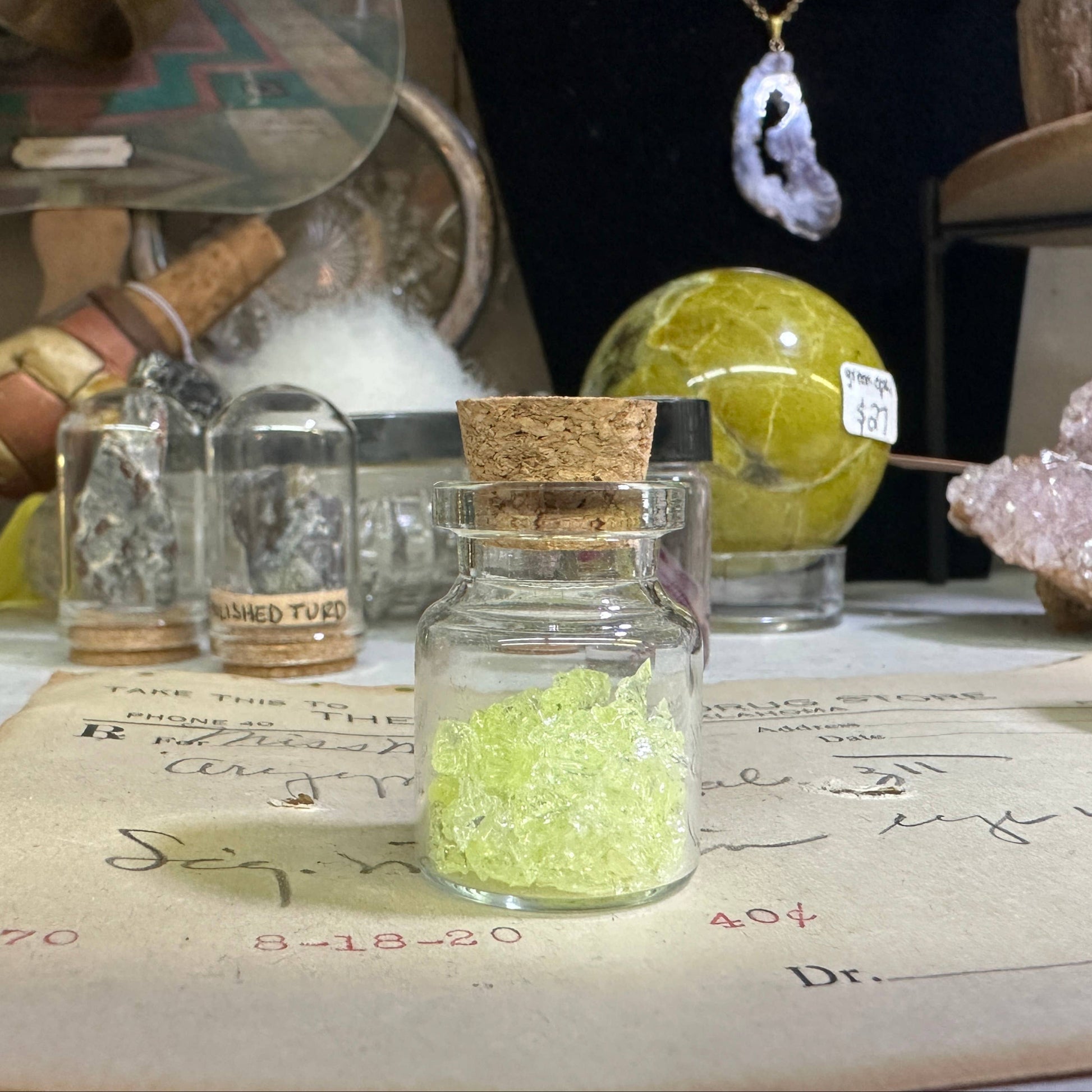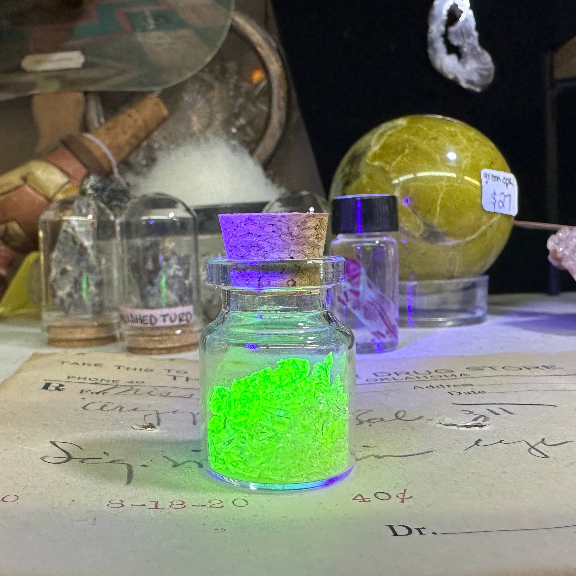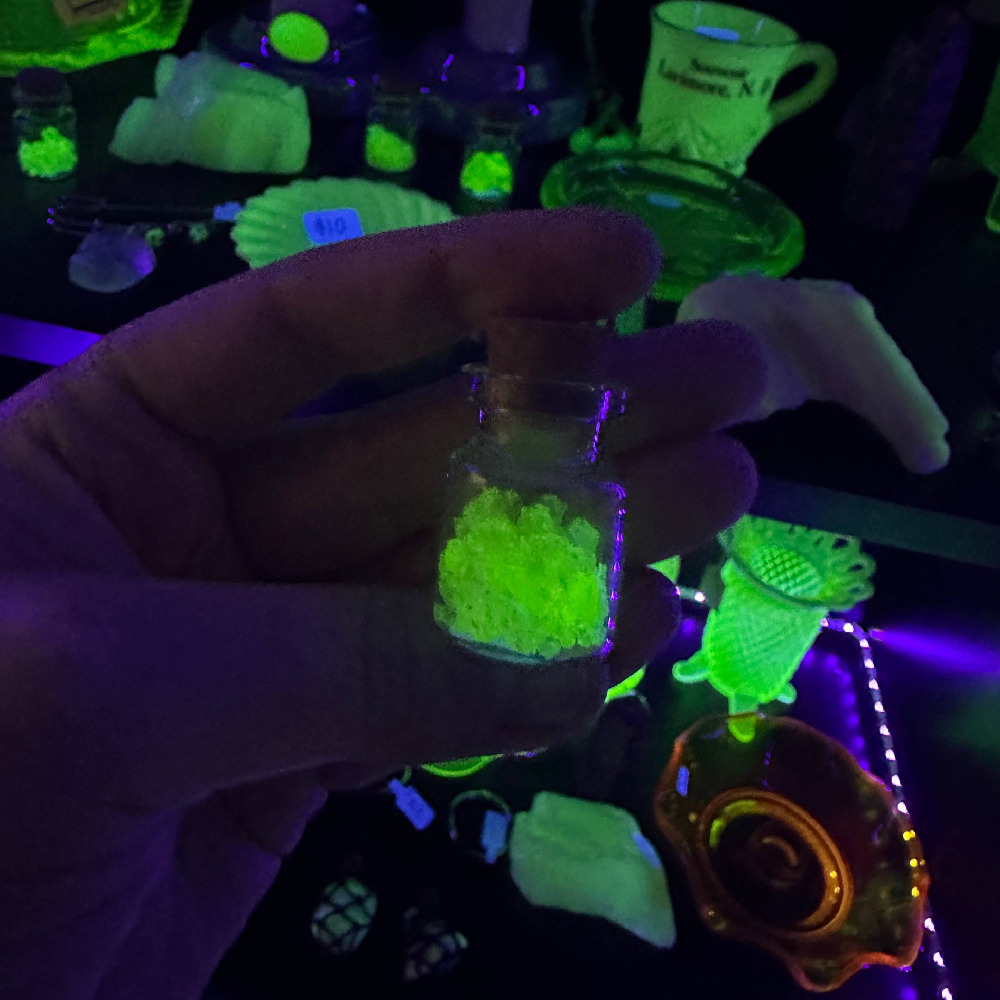 A beautiful little bottle (1.5”) with real uranium glass inside. Glass is green or yellow and glows bright under uv / black light. Corks are secured and unable to be removed!