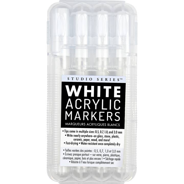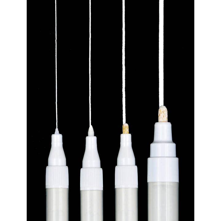 Fine-line to bold! Seamless flow of paint provides a flawless experience. Premium opaque white paint is water-resistant once completely dry. How to use: Gently shake marker. Uncap. Press tip down against surface until paint flows to tip, then draw. Recap marker right away when finished. Set of 4 white acrylic paint markers. Reusable case safeguards markers when not in use. Enjoy effortless writing, drawing, and crafting with quick-drying white paint!